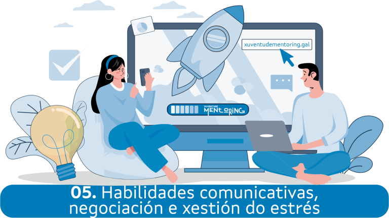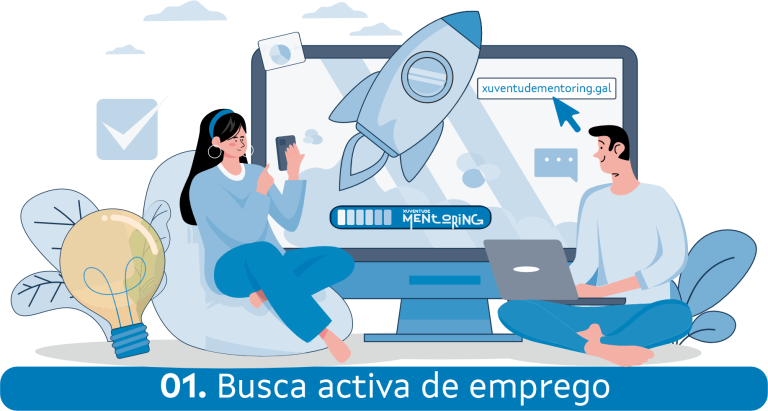 Formacións dispoñibles para as persoas beneficiarias do programa Xuventude Mentoring con tres itinerarios de formación: búsqueda de emprego, autoemprego e competencias trasversais.